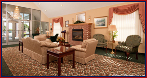 The lobby is a cozy entrance with seating warmed by a brick fireplace. The reception area is located at the main entrance for immediate assistance to all visitors.